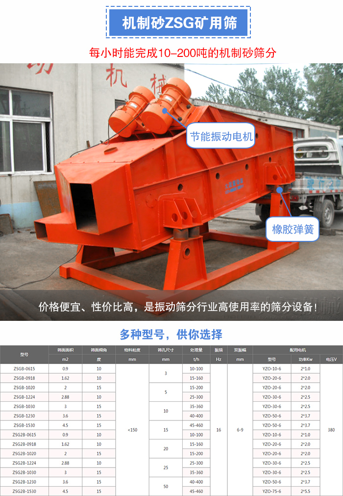 機(jī)制砂所使用的ZSG礦用篩是屬于重型振動(dòng)篩,它主要用于大規(guī)模的篩分工作中,型號(hào)有:ZSG-0918、ZSG-1020、ZSG-1224、ZSG-1030、ZSG-1530等。